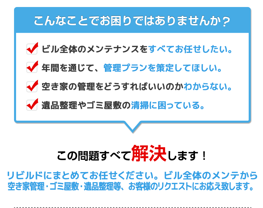 日常の清掃業務から定期清掃、設備機器の運転監視や保守管理、保安点検等、ビルのトータル・メンテナンスをする私どもリビルドでは、お客様のニーズに合わせて、ビルの全体のトータルメンテナンスのご提案を致します。